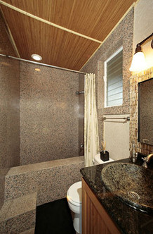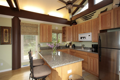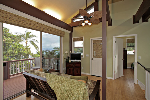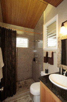 Upstairs, large sliding glass doors open to two decks, one off the kitchen and one off the bedroom, with views of the neighboring islands of Molokini, Kaho'olawe, and Lanai. The master bedroom has a queen bed to comfortably sleep 2 people. The upstairs interior has many special touches including vaulted ceilings, granite throughout, bamboo floors, upscale faucets, and accent lighting.